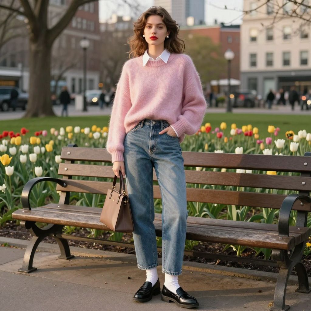 - Fit type: roomy knit, structured collar, relaxed denim, flat loafer