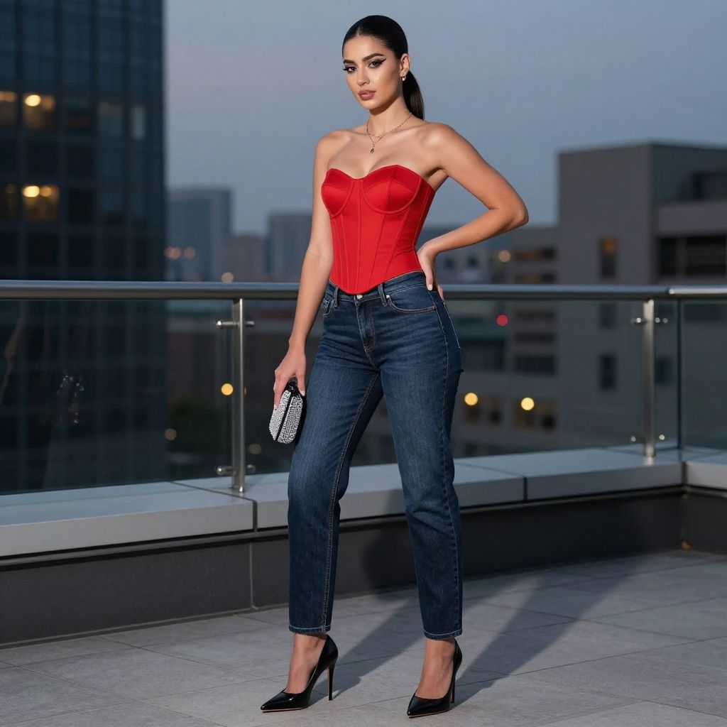 - Key pieces: corset top, barrel jeans, stiletto pumps