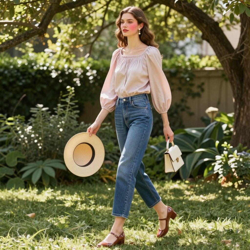 - Key pieces: puffy sleeve blouse, barrel jeans, patent Mary Janes