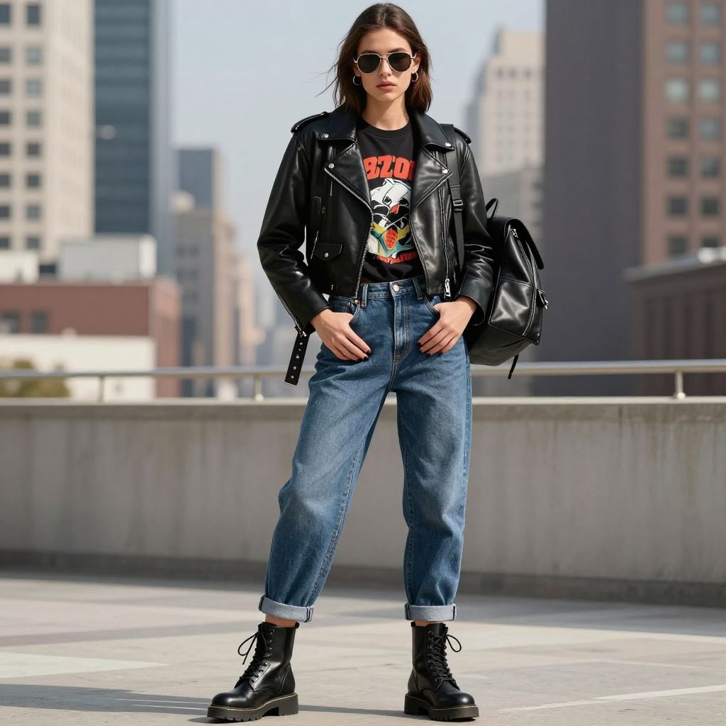 - Key pieces: cropped moto jacket, graphic tee, barrel jeans, combat boots