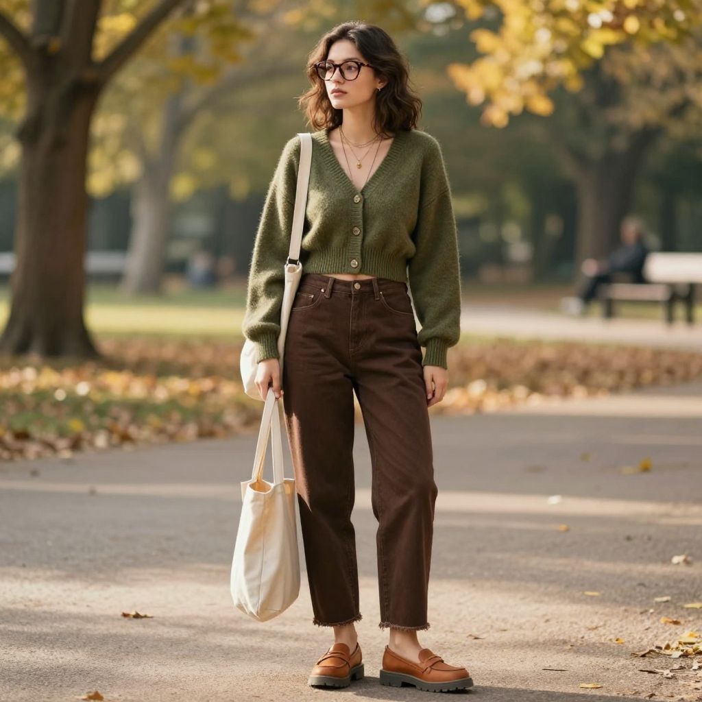 - Key pieces: cropped cardigan, barrel jeans, lug sole loafers