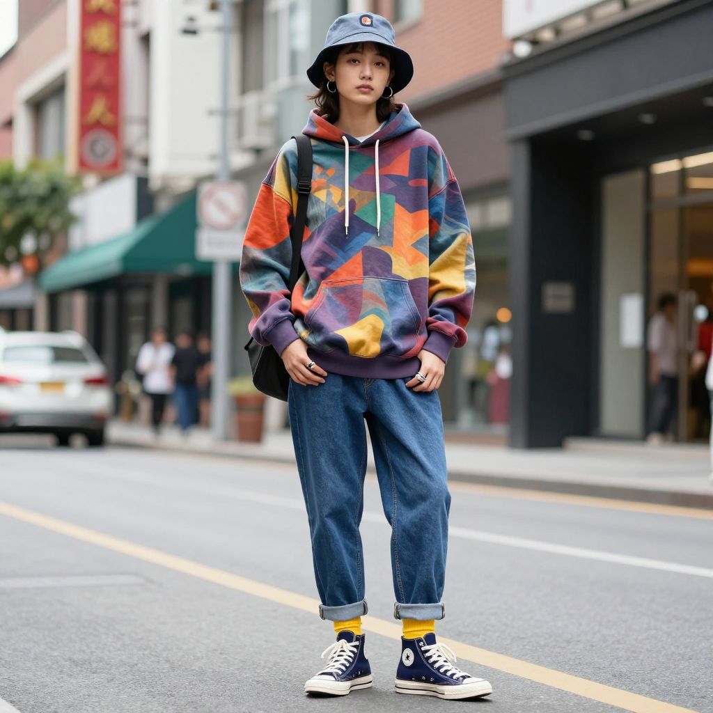 - Key pieces: graphic hoodie, barrel jeans, high top sneakers