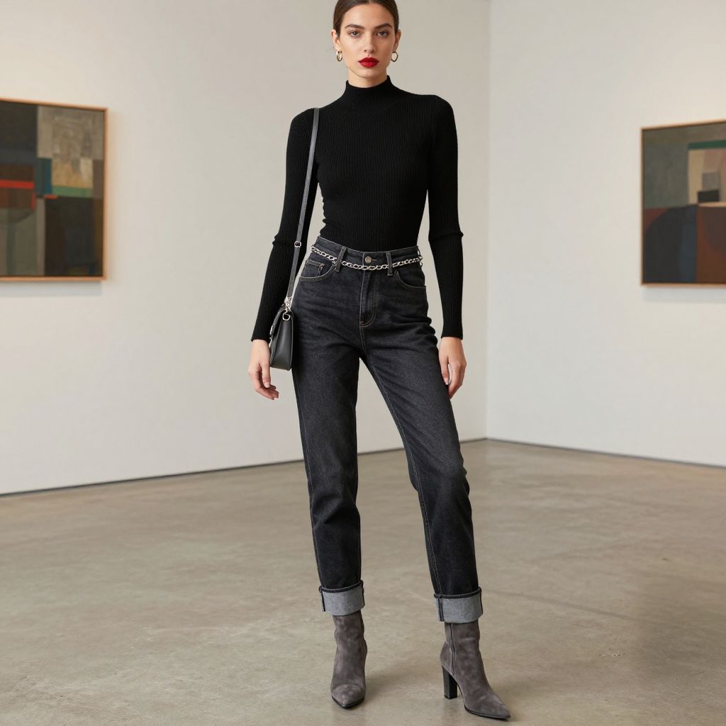 - Styling method: full tuck, layered chain belt, cuffed jean above boot shaft
