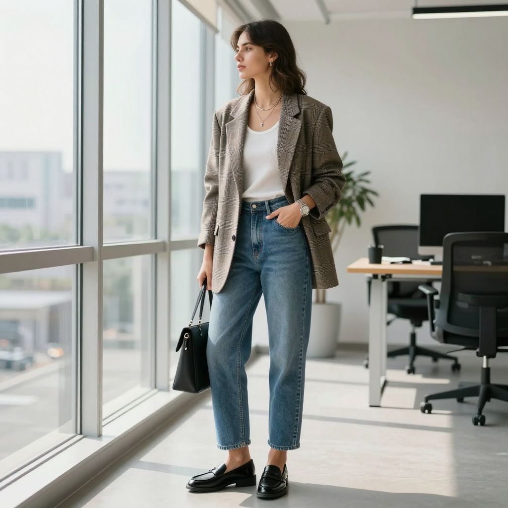 - Key pieces: oversize blazer, ribbed tank, barrel jeans, polished loafers
