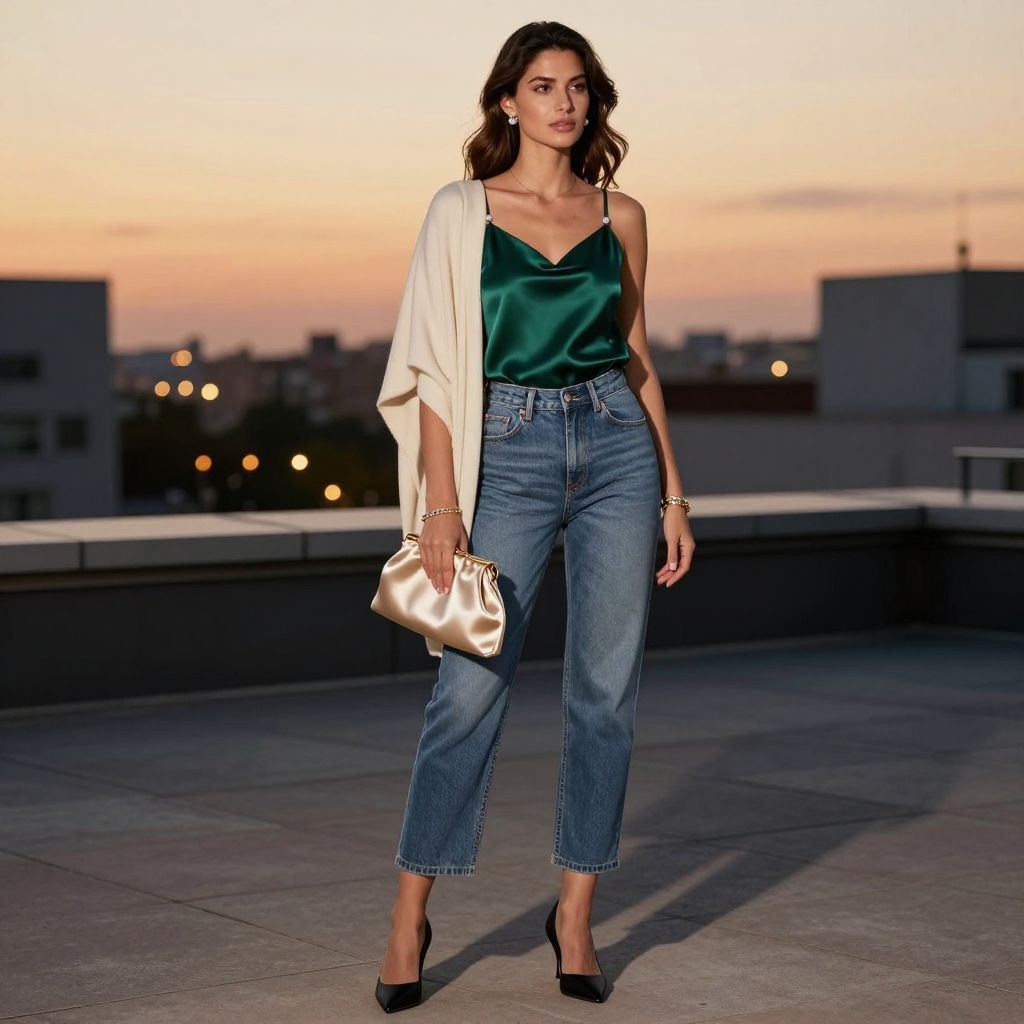 - Key pieces: satin cami, barrel jeans, kitten heels, light cardigan