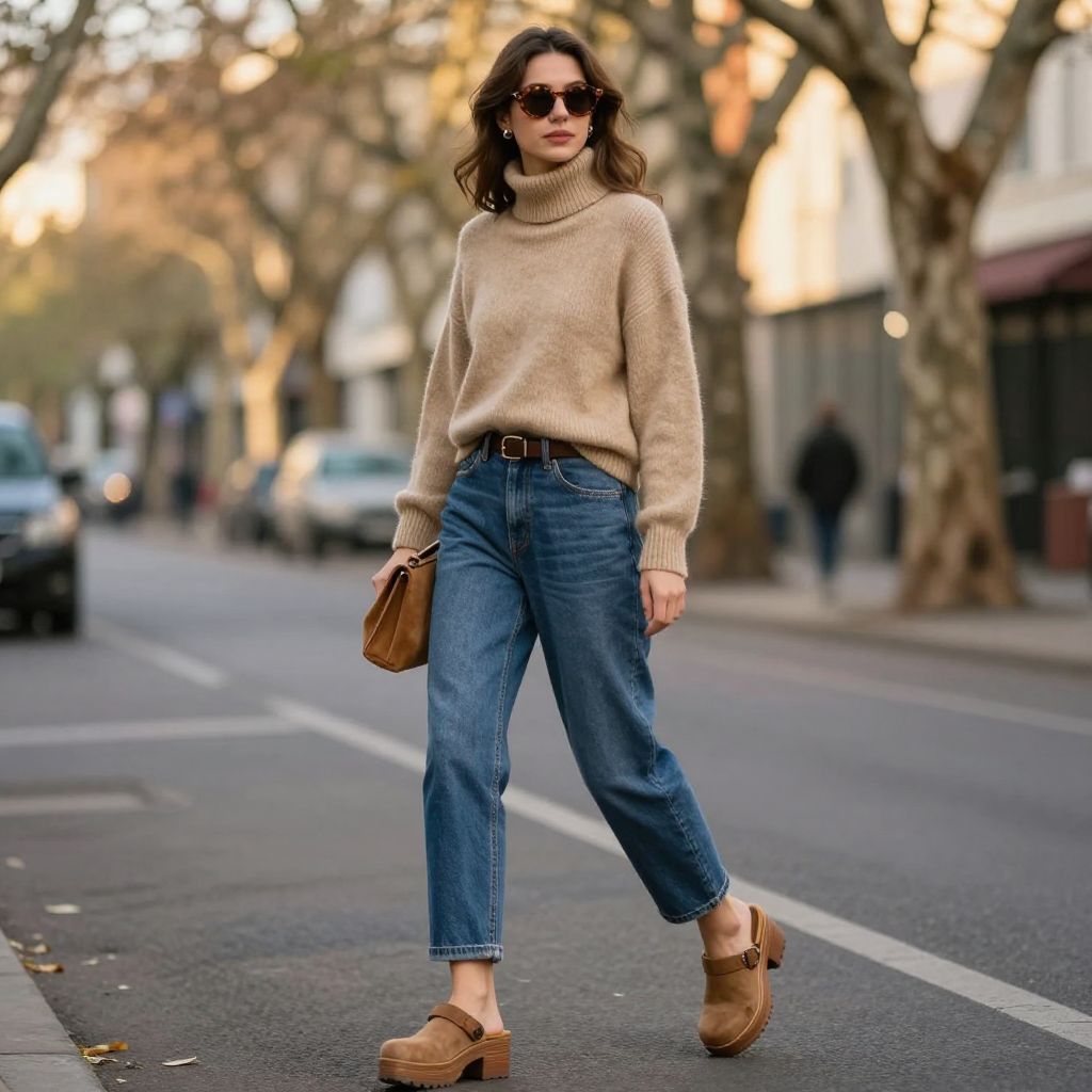- Key pieces: knit turtleneck, barrel jeans, platform clogs