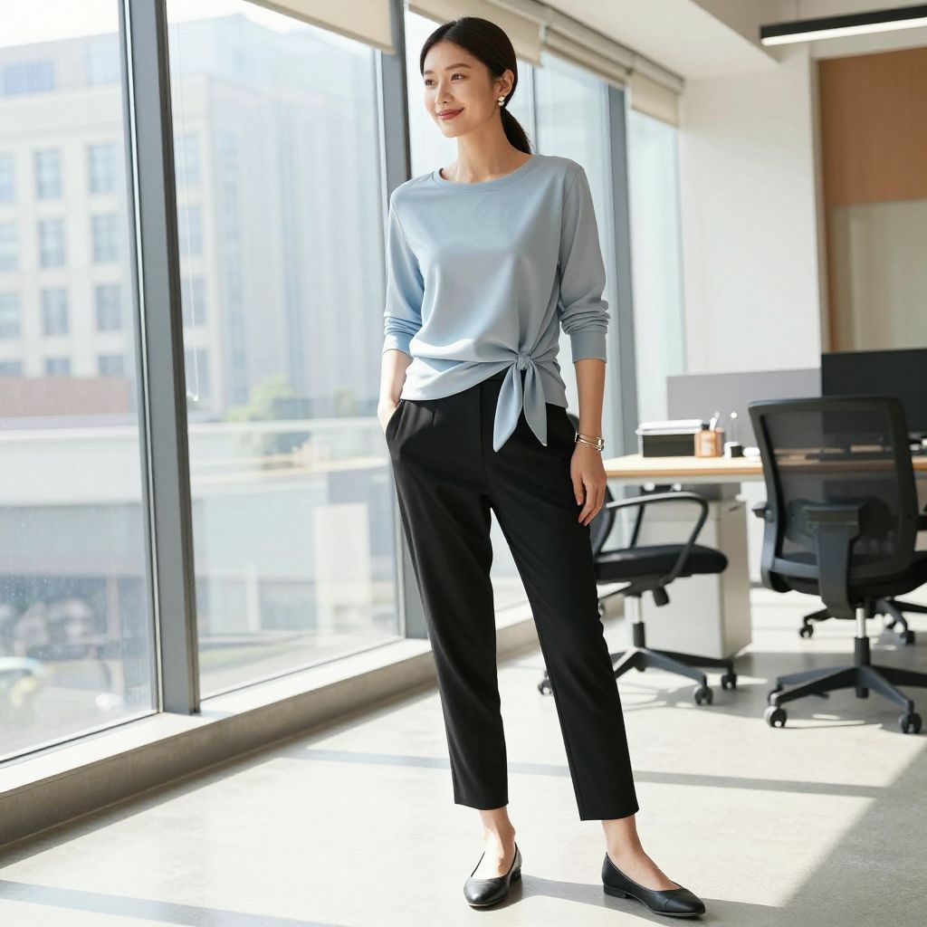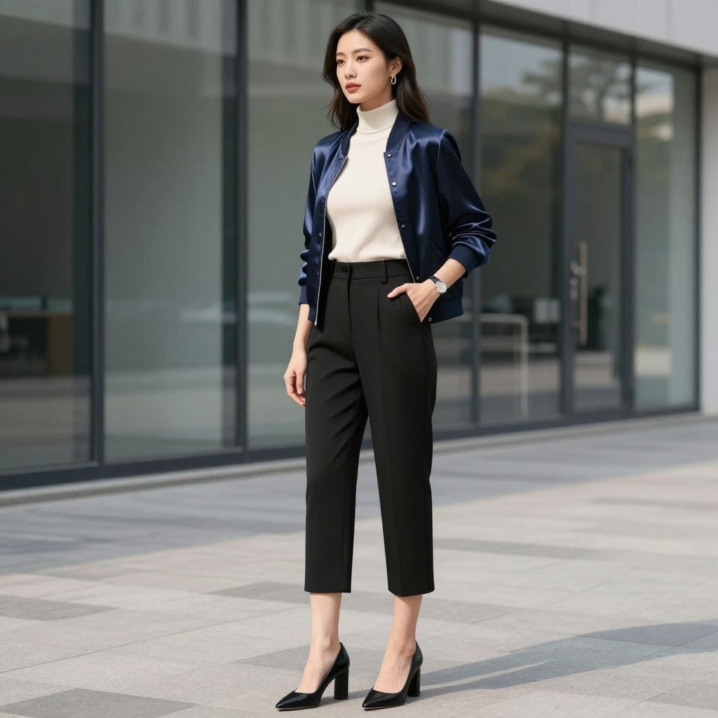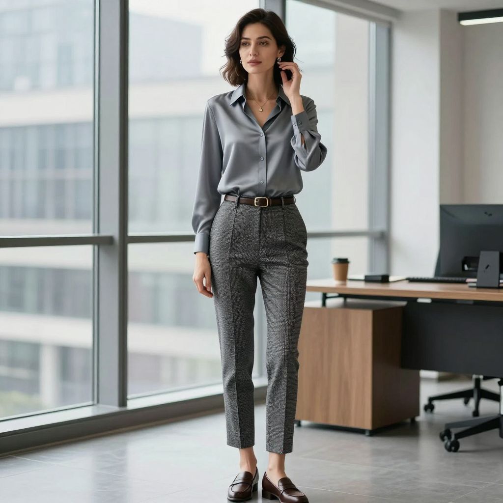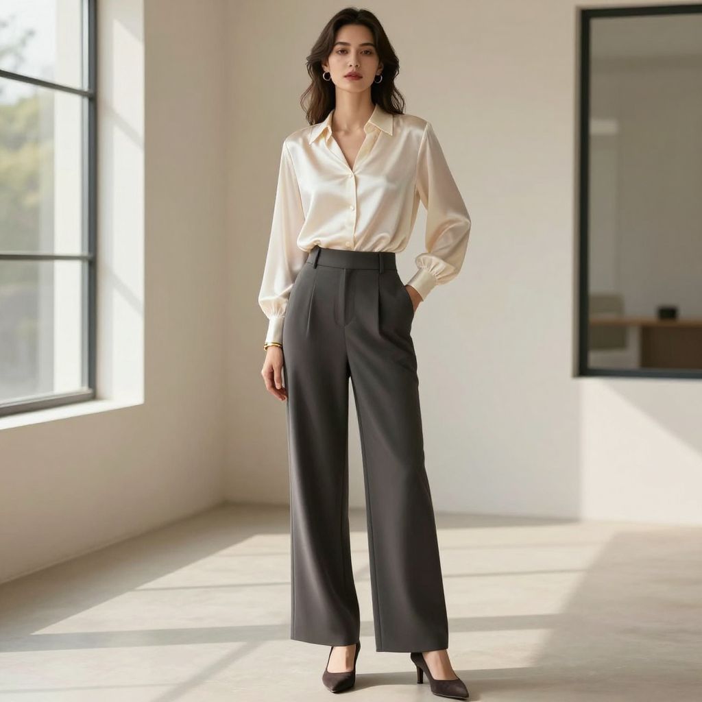 • Key Pieces: satin blouse, crepe trousers, suede pumps