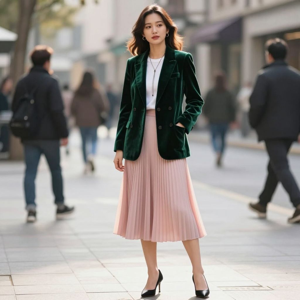 • Key Pieces: velvet blazer, white tee, pleated skirt