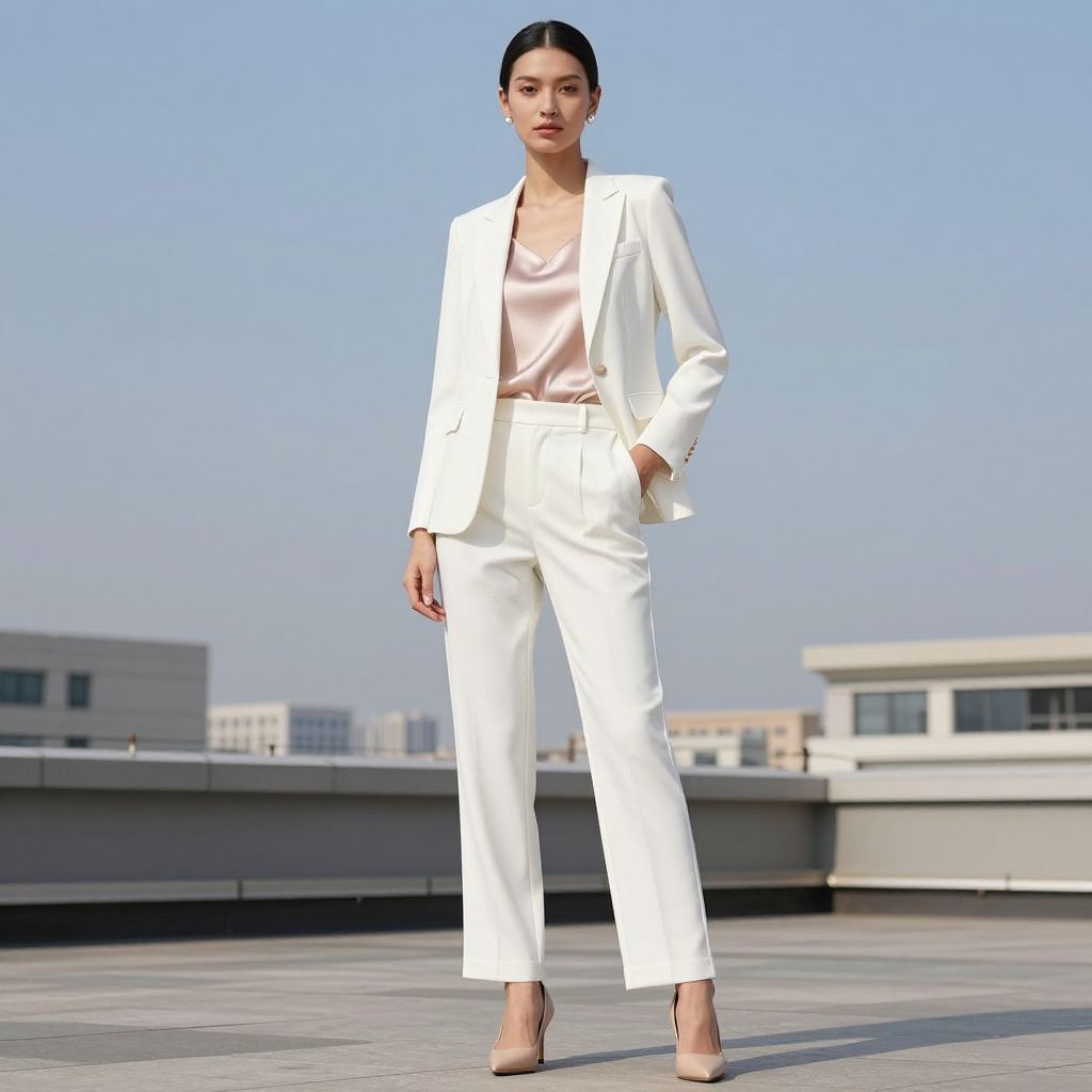 • Key Pieces: linen blazer, linen trousers, silk tank