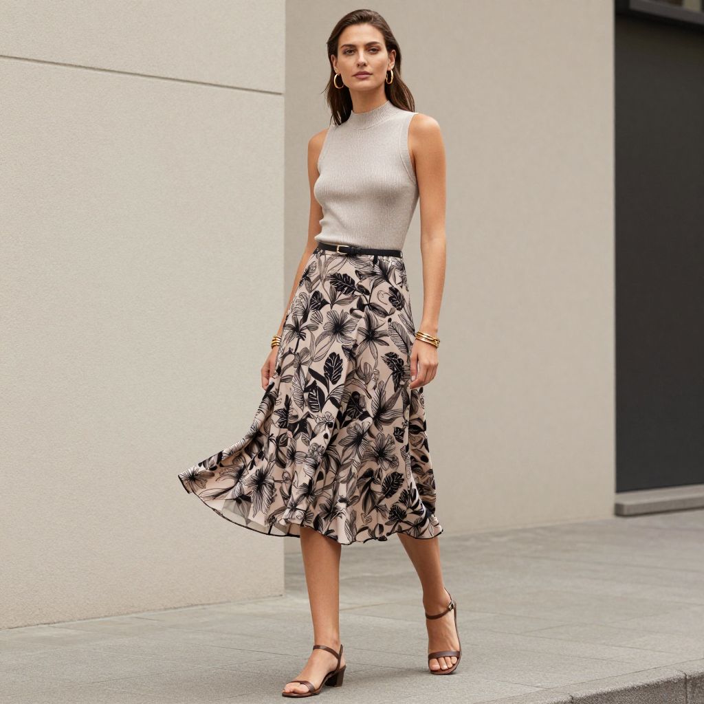 • Key Pieces: rib knit top, printed midi skirt, sandals