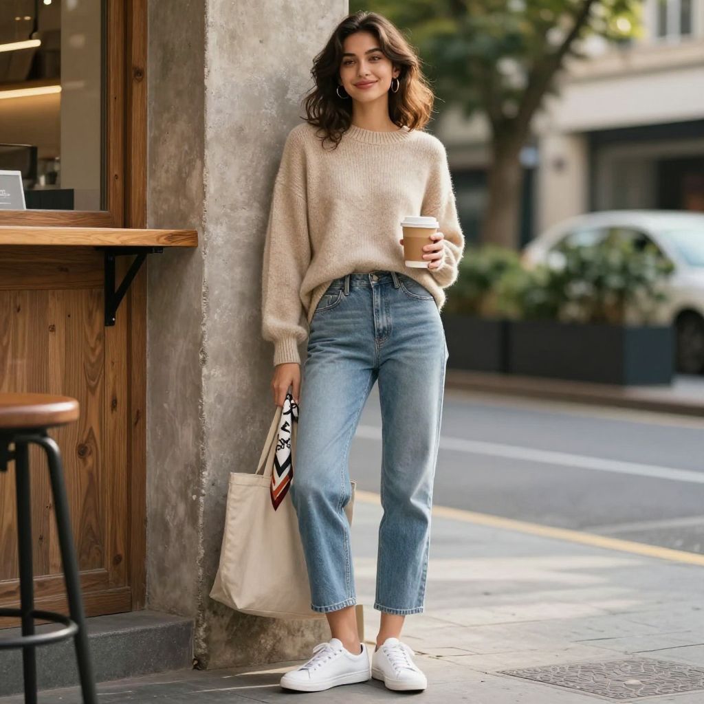 - Key pieces: cotton sweater, cropped straight jeans, white sneakers, small scarf