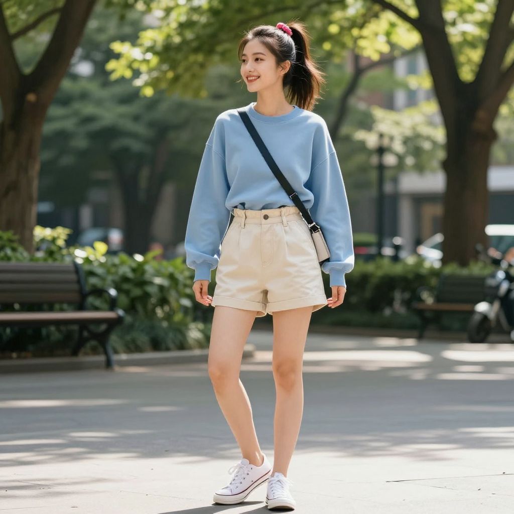 - Key pieces: lightweight sweatshirt, paper bag waist shorts, canvas sneakers