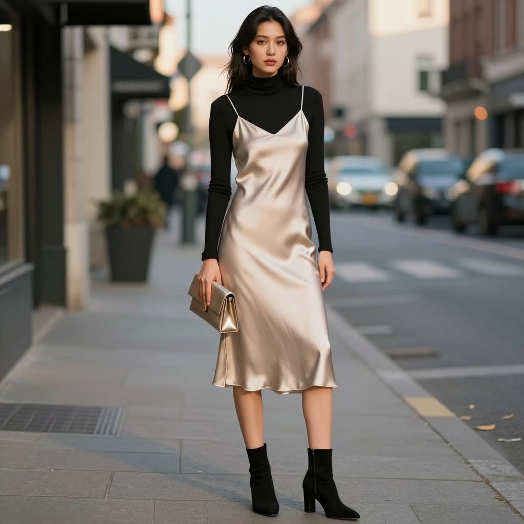 - Key pieces: mock neck top, silk slip dress, sock boots