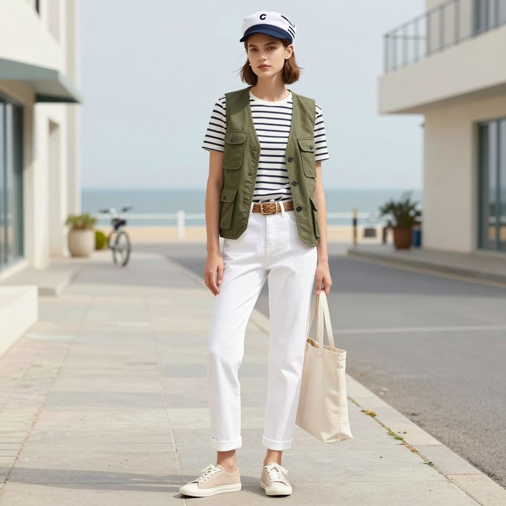 - Key pieces: cargo vest, stripe tee, white jeans, neutral sneakers