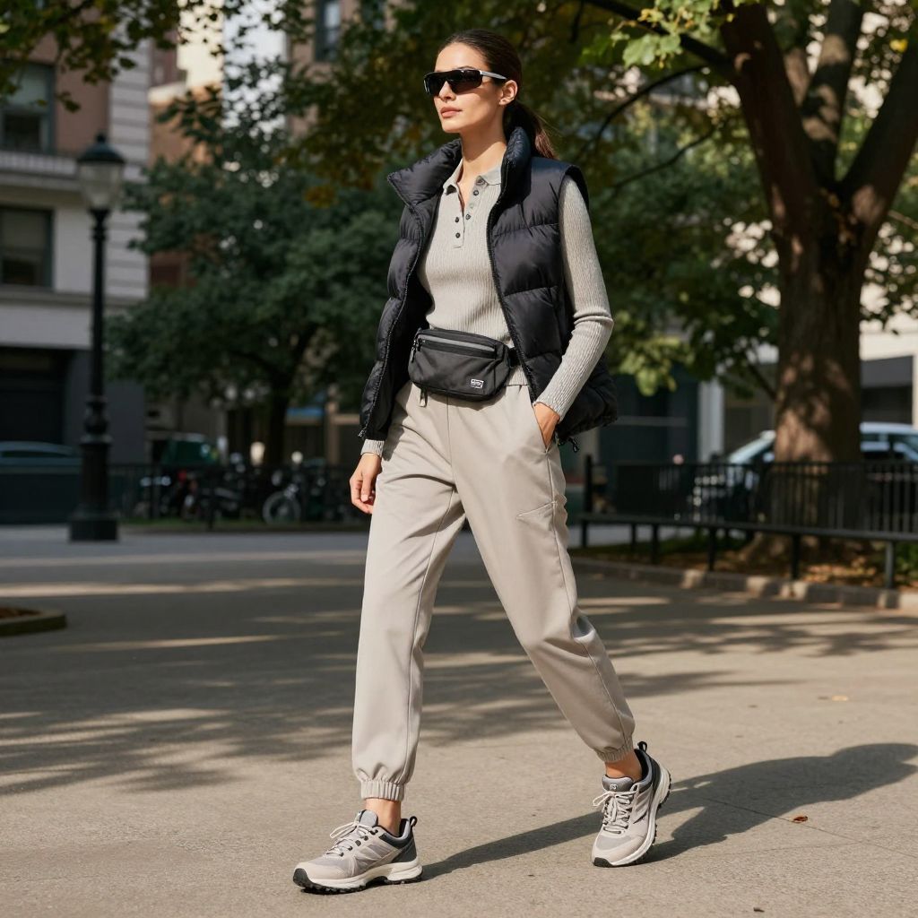 - Key pieces: puffer vest, waffle henley, joggers, trail sneakers