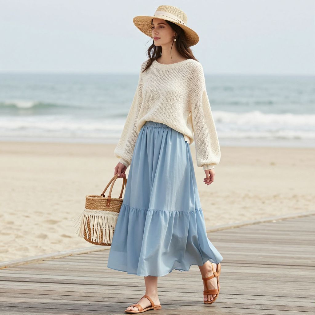 - Key pieces: linen dress, chunky cardigan, espadrille flats
