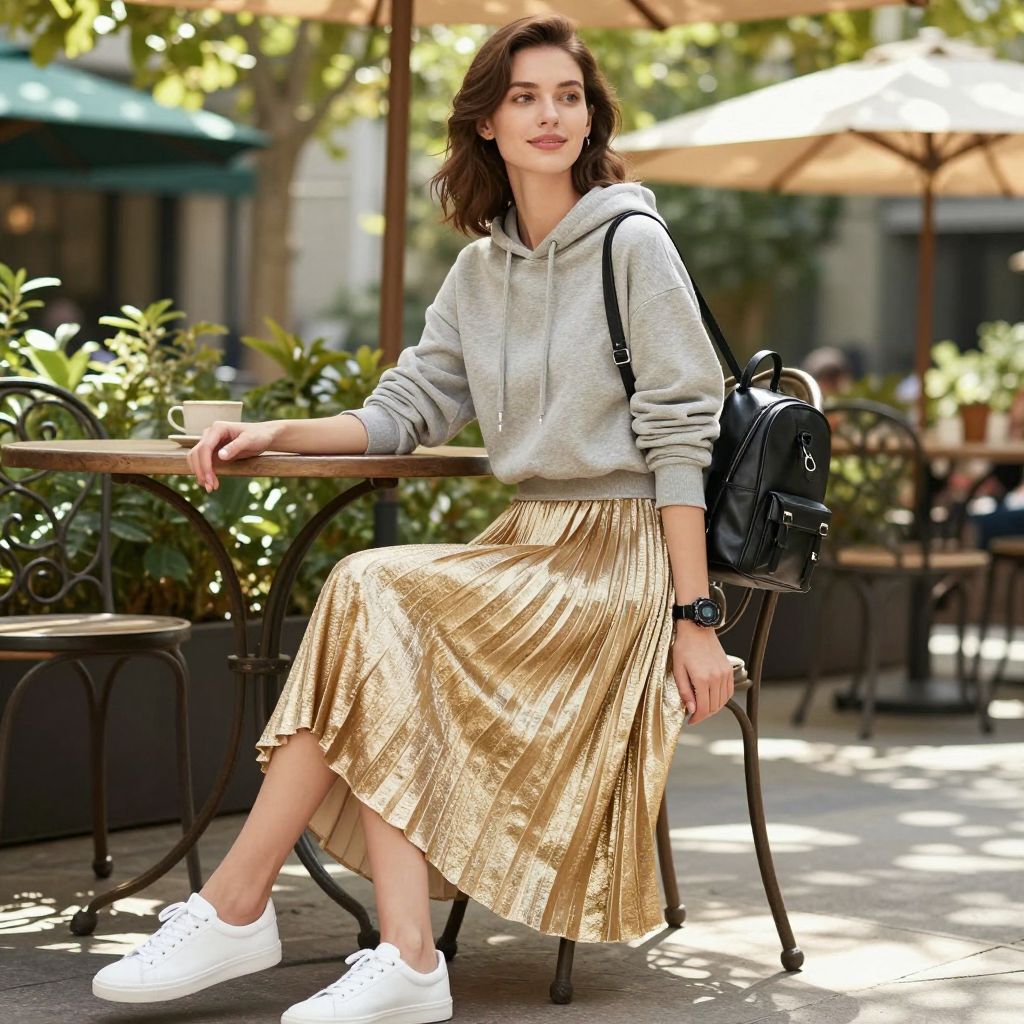 Grab a lightweight cotton hoodie and pair it with a shimmering pleated midi skirt for that mix of street and chic.