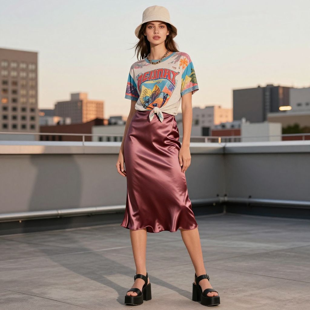 - Key pieces: graphic tee, satin bias skirt, platform sandals