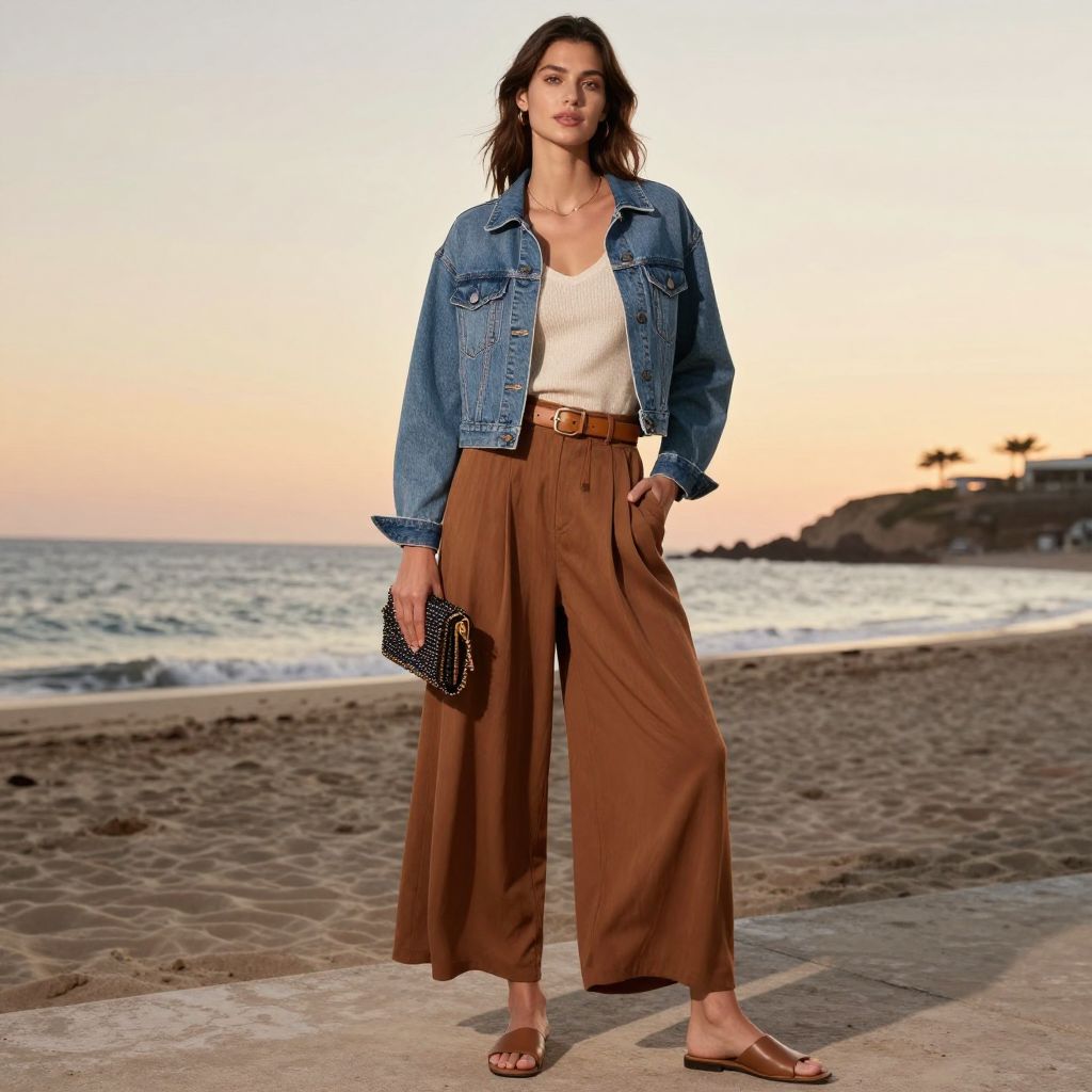 - Key pieces: cropped denim jacket, knit tank, palazzo pants, flat slides