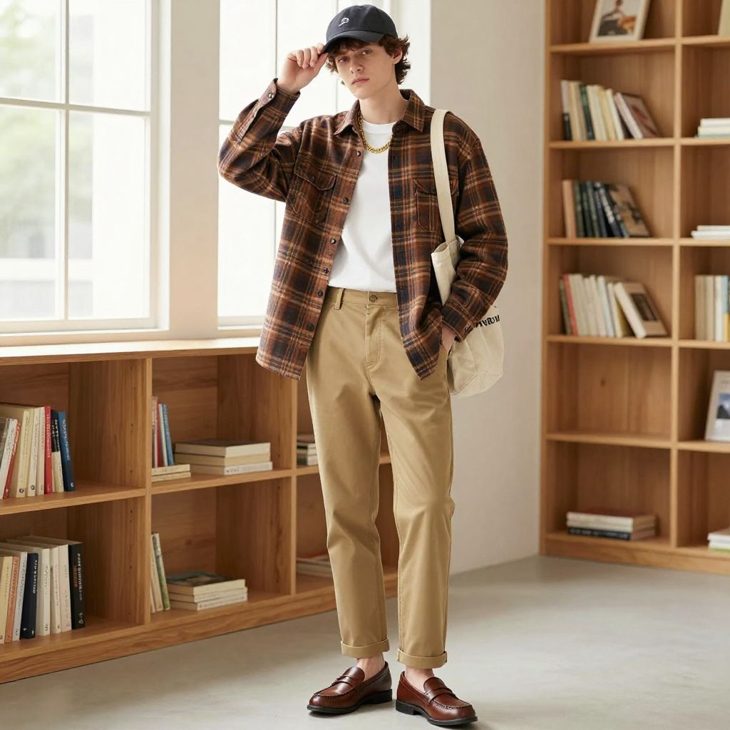 - Key pieces: oversized flannel, slim chinos, leather slip ons