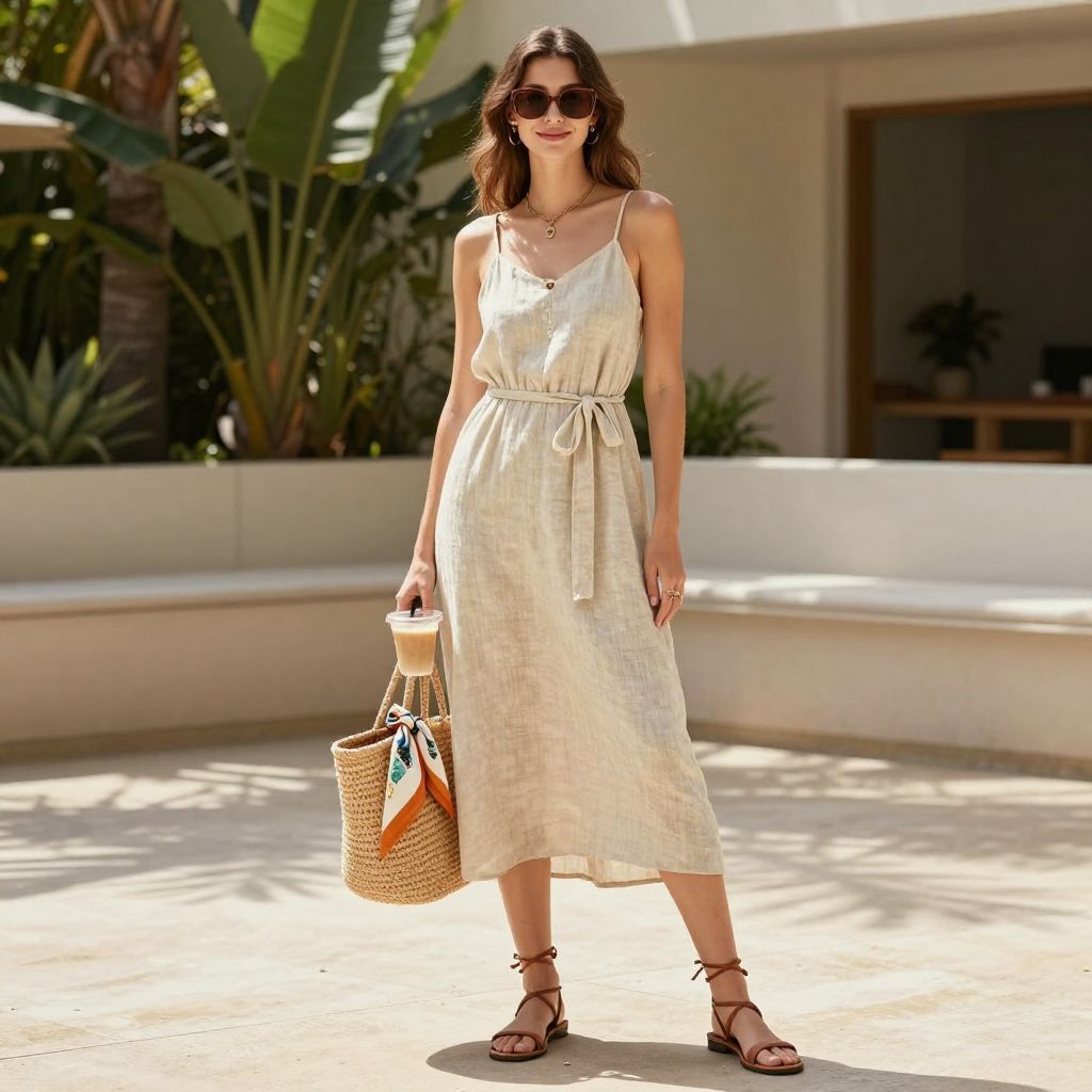 - Key pieces: linen sundress, strappy leather sandals, woven tote, oversize sunglasses