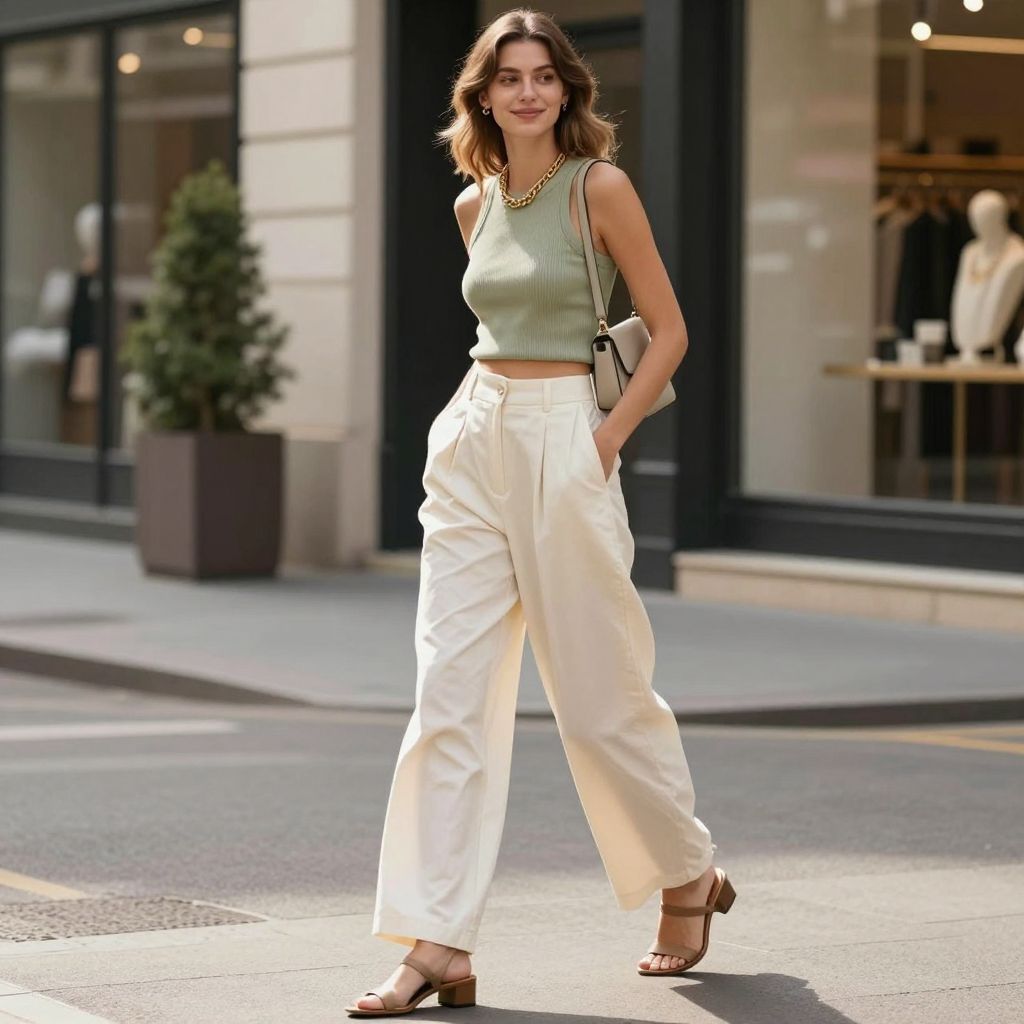 - Color play: pair ivory trousers with a sage tank for a soft contrast