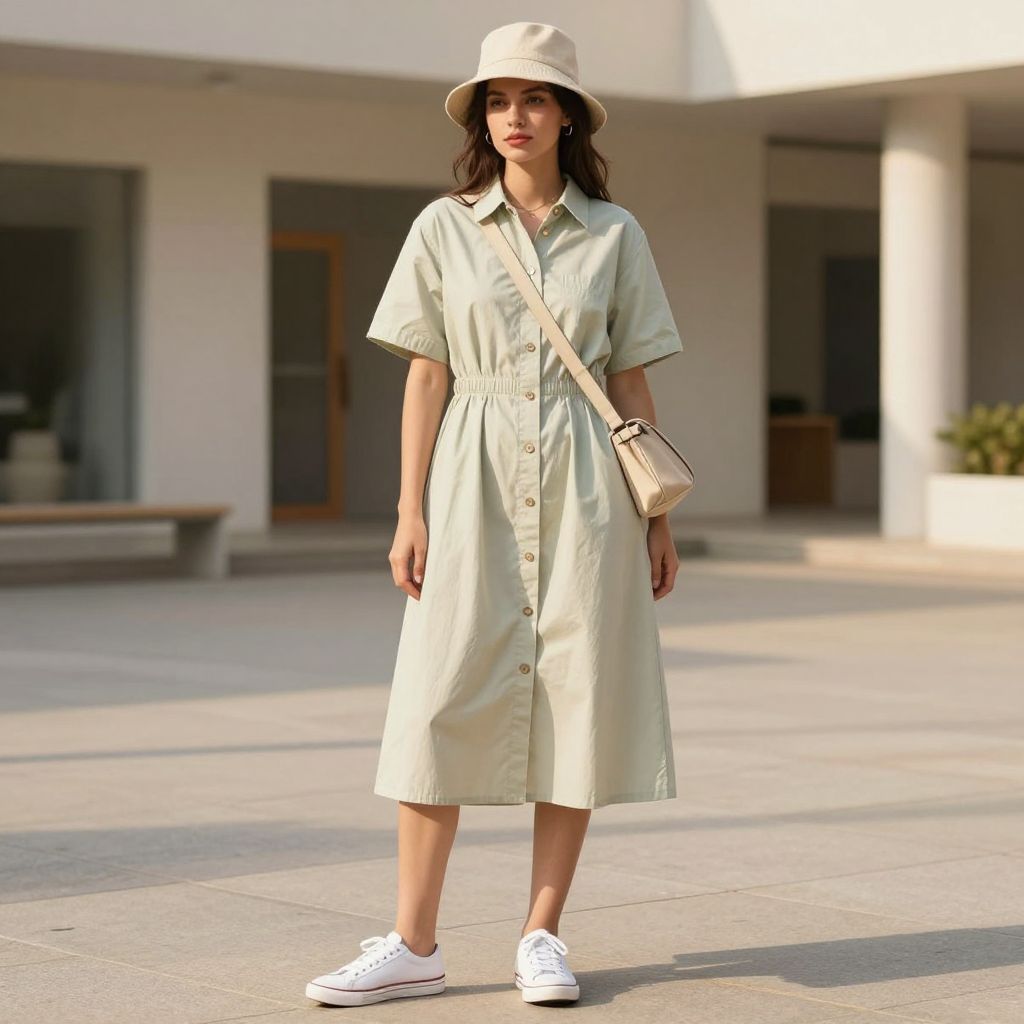 - Key pieces: cotton poplin midi, white sneakers, canvas bucket hat, crossbody pouch