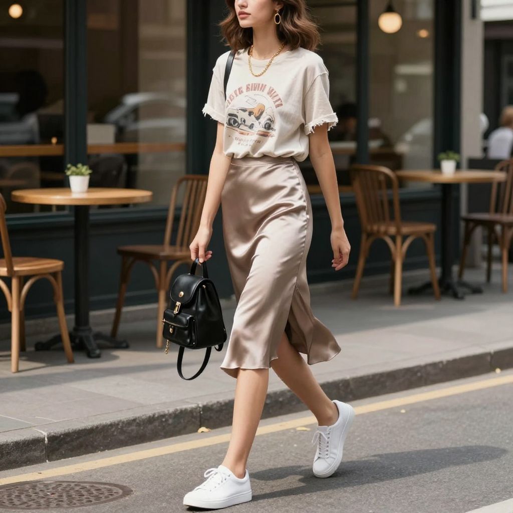 - Key pieces: graphic tee, satin bias skirt, sneakers or block heel sandals, mini backpack