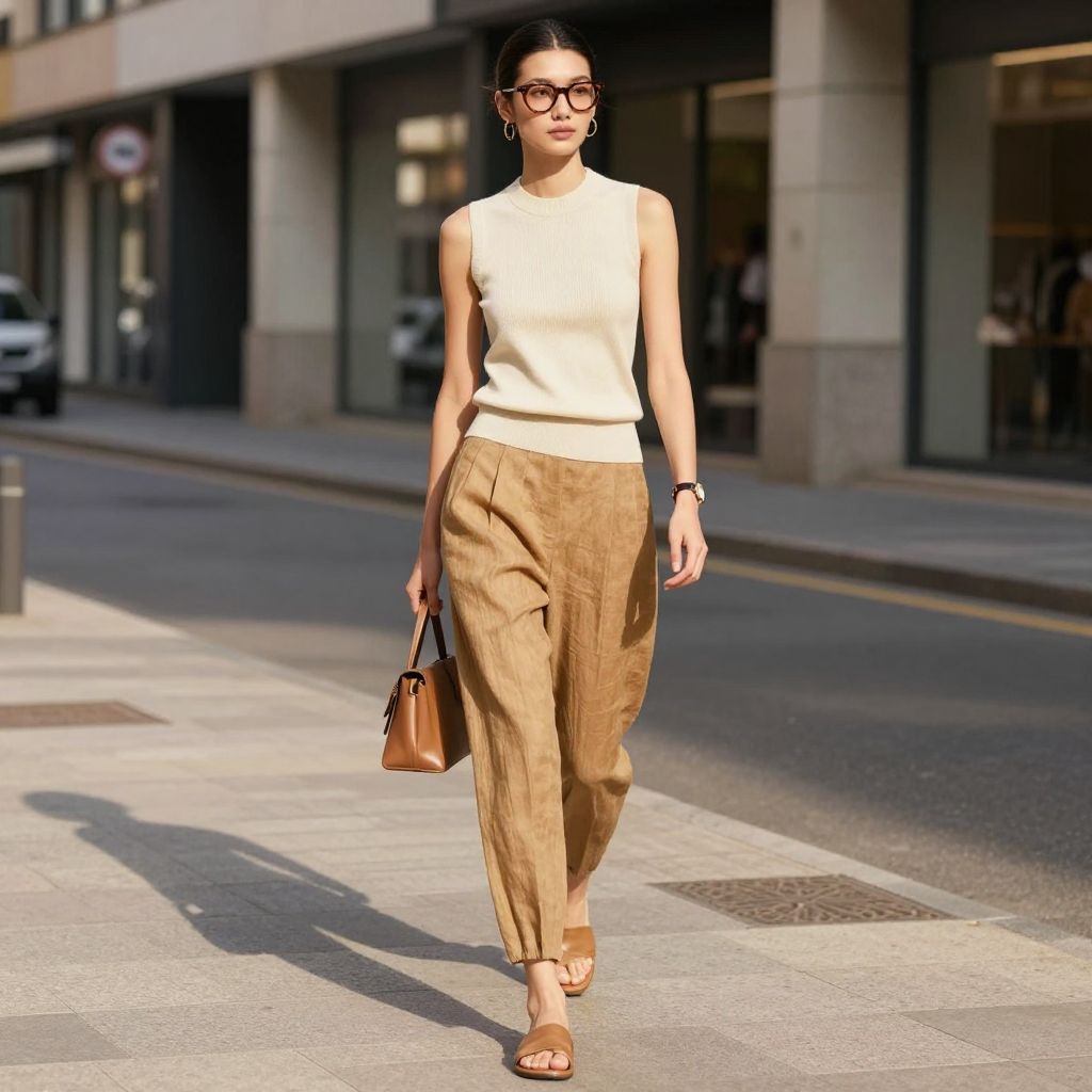 - Key pieces: sleeveless knit, pleated linen trousers, leather slides, mini bag