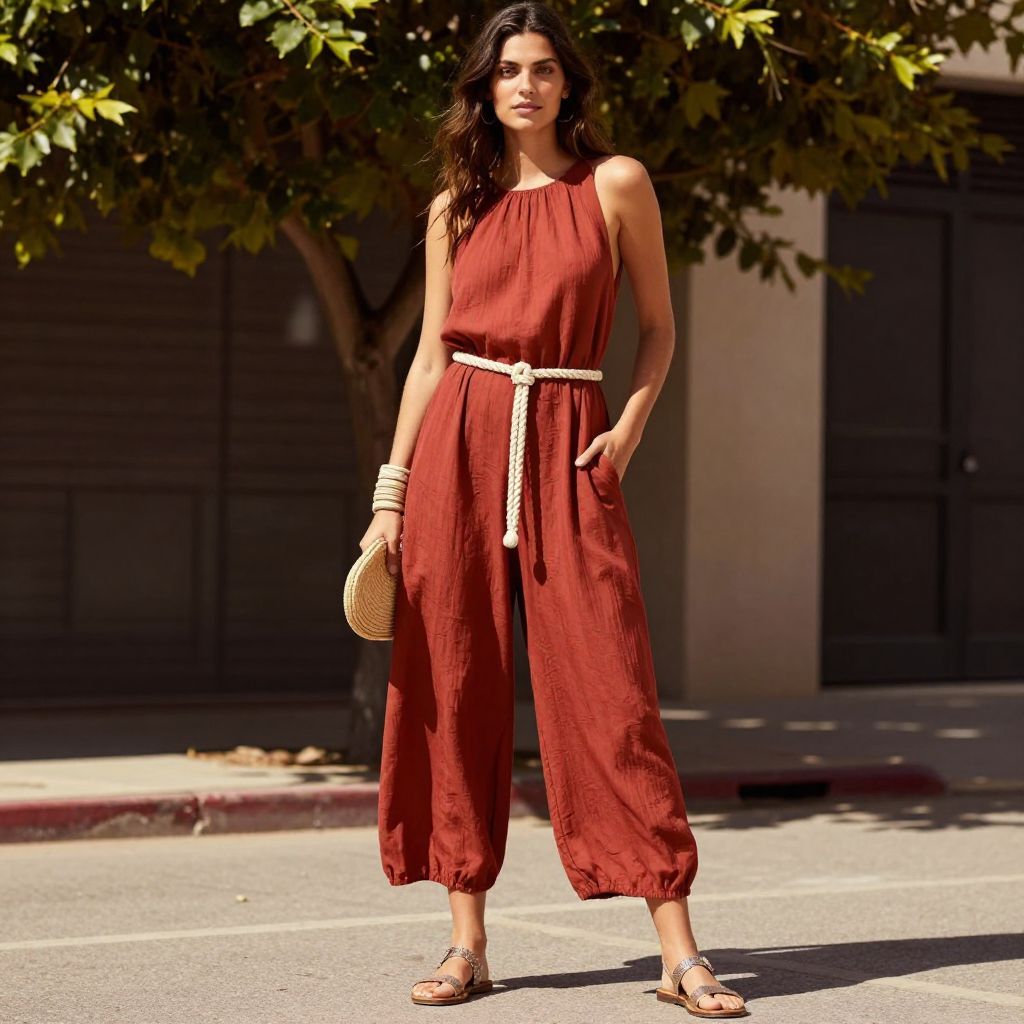 - Key pieces: viscose jumpsuit, rope belt, metallic flat sandals, straw clutch