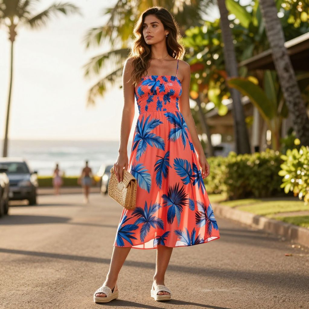 - Key pieces: tropical midi dress, espadrilles, rattan clutch
