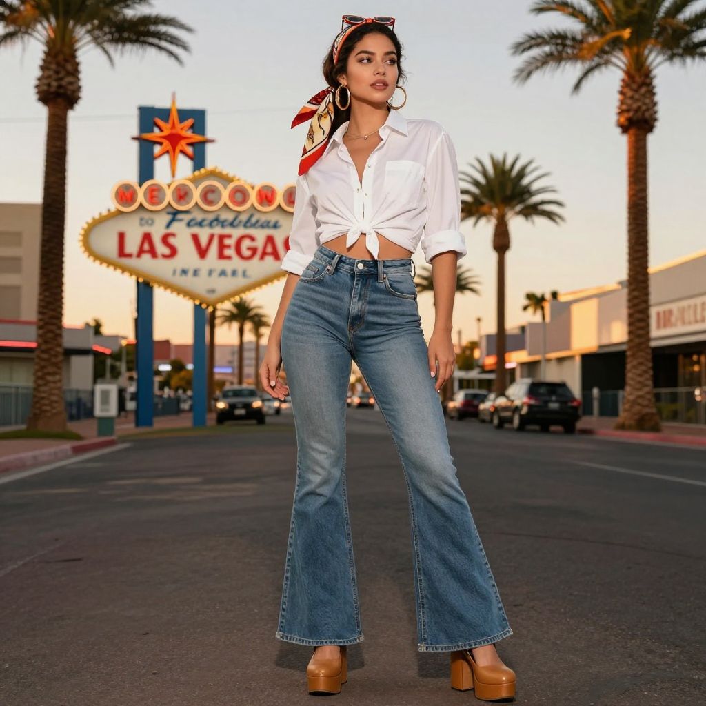 Channel retro charm with a crisp cropped shirt knotted above the waist and flare jeans that sweep the ground.