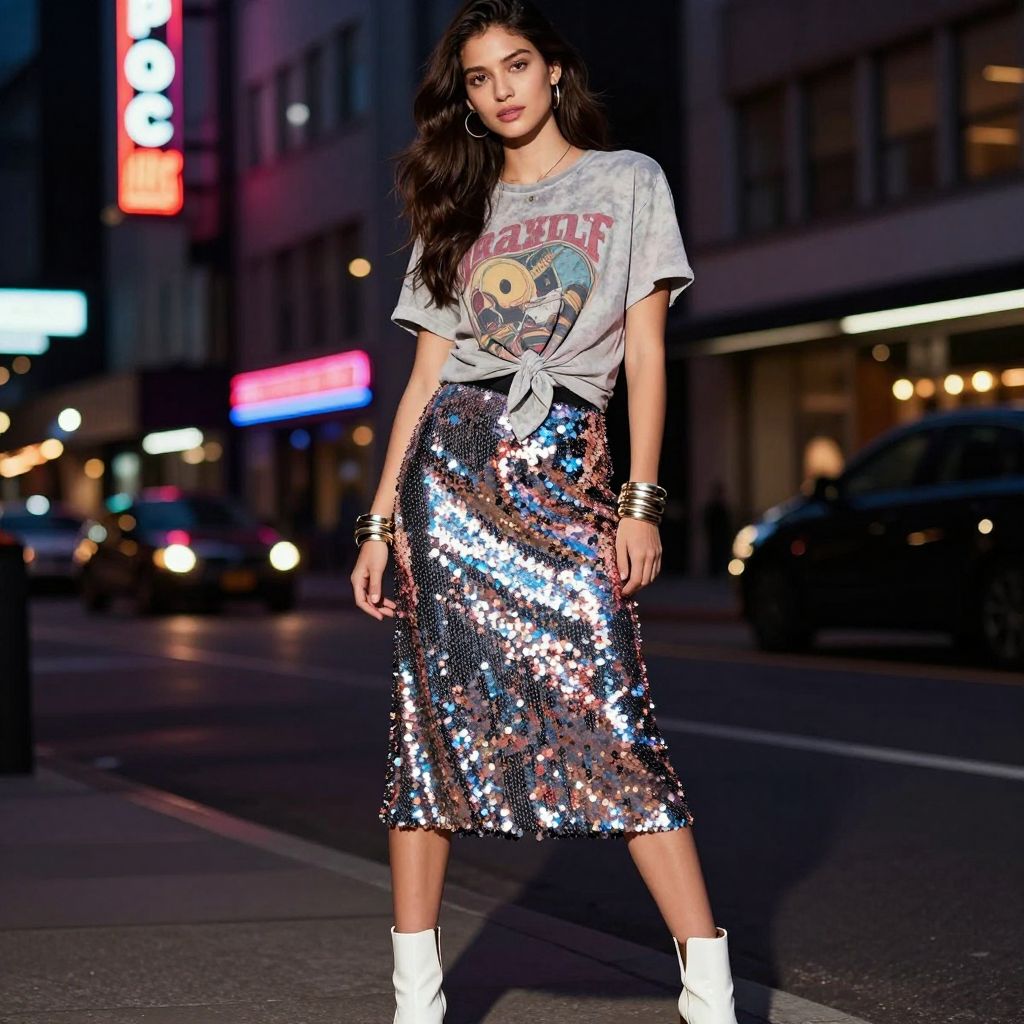 - Key pieces: vintage tee, sequin skirt, ankle boots