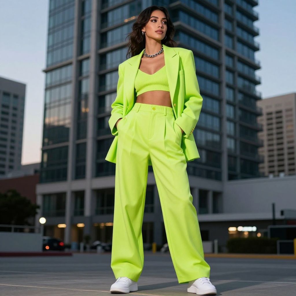 Want to shout style from ten miles away? A lime neon suit and a simple bralette handle that loud task.