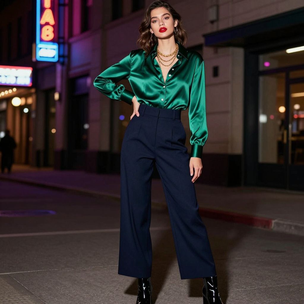 - Key pieces: Satin button shirt, wool blend wide leg trousers, layered gold chains, square toe loafers
