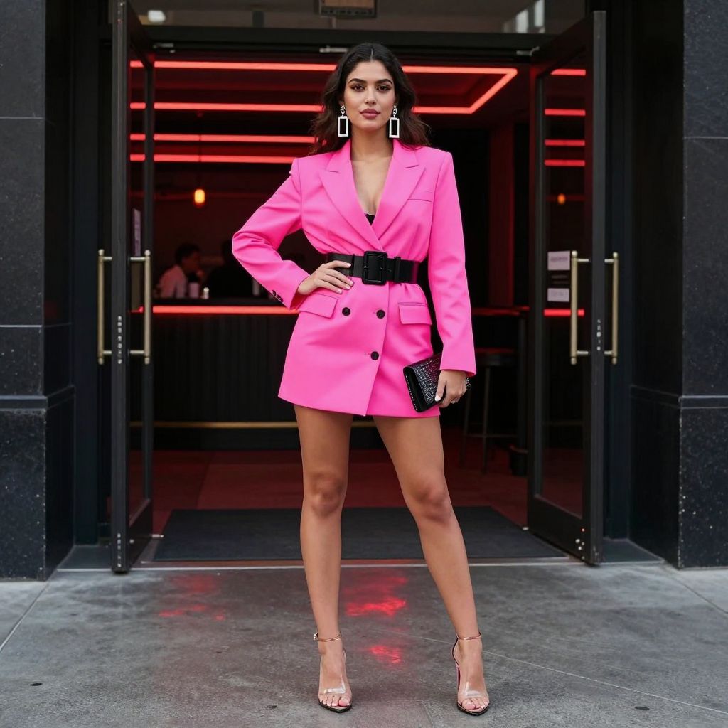 - Key pieces: Printed blazer dress, chunky belt, clear strap heels, geometric earrings