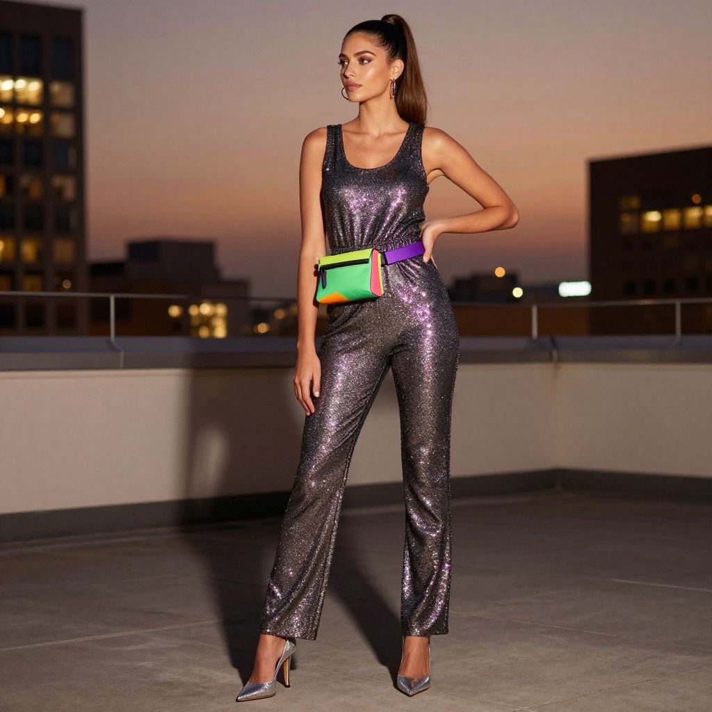 - Key pieces: Glitter jumpsuit, nylon belt bag, mirror pumps, thin hoop earrings