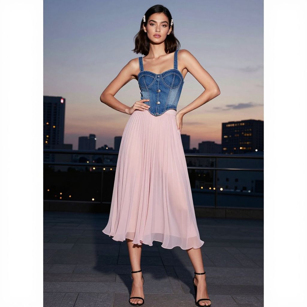 - Key pieces: Denim bustier, chiffon pleated skirt, ankle strap heels, pearl clips