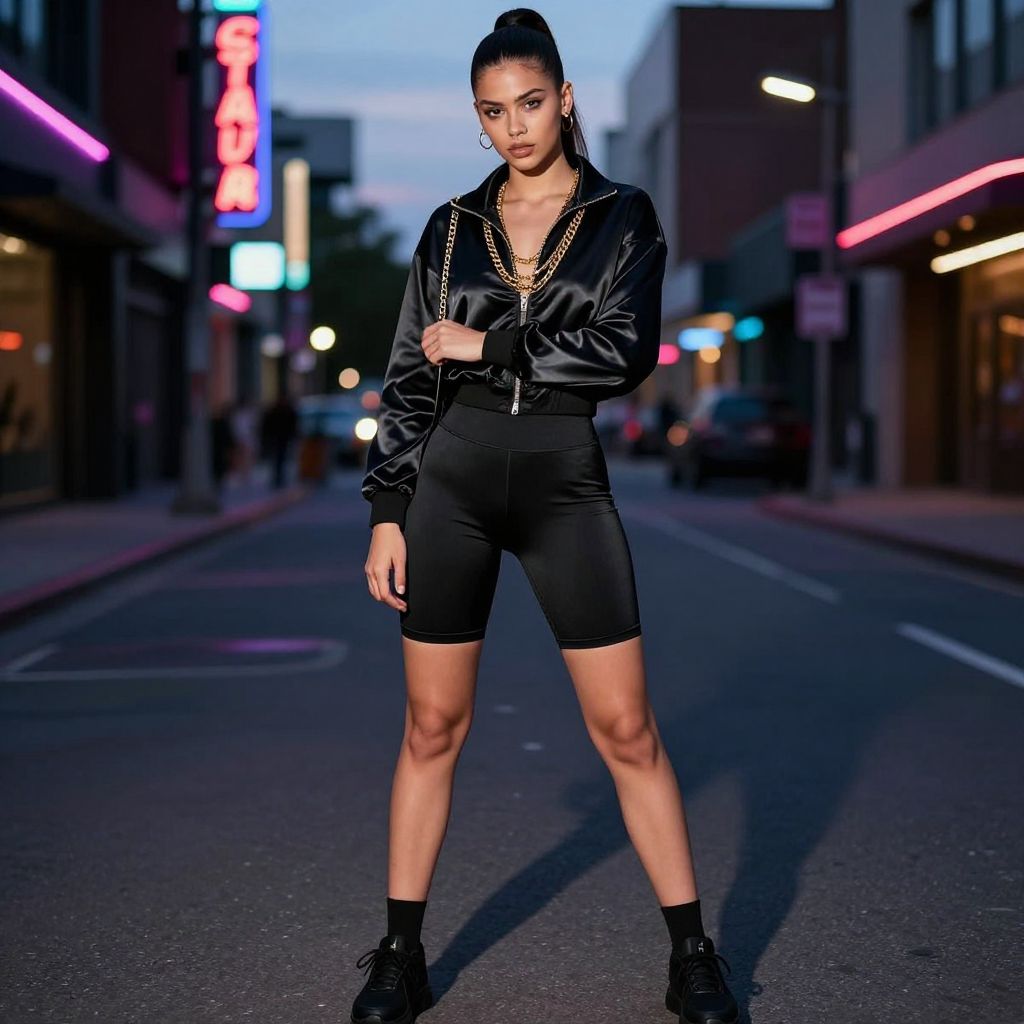 - Key pieces: Satin track jacket, spandex bike shorts, sock sneakers, layered chains