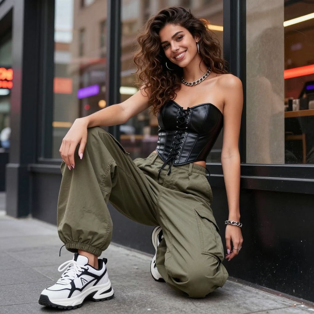 - Key pieces: Faux leather corset, cotton cargo pants, chunky chain bracelet, sneakers