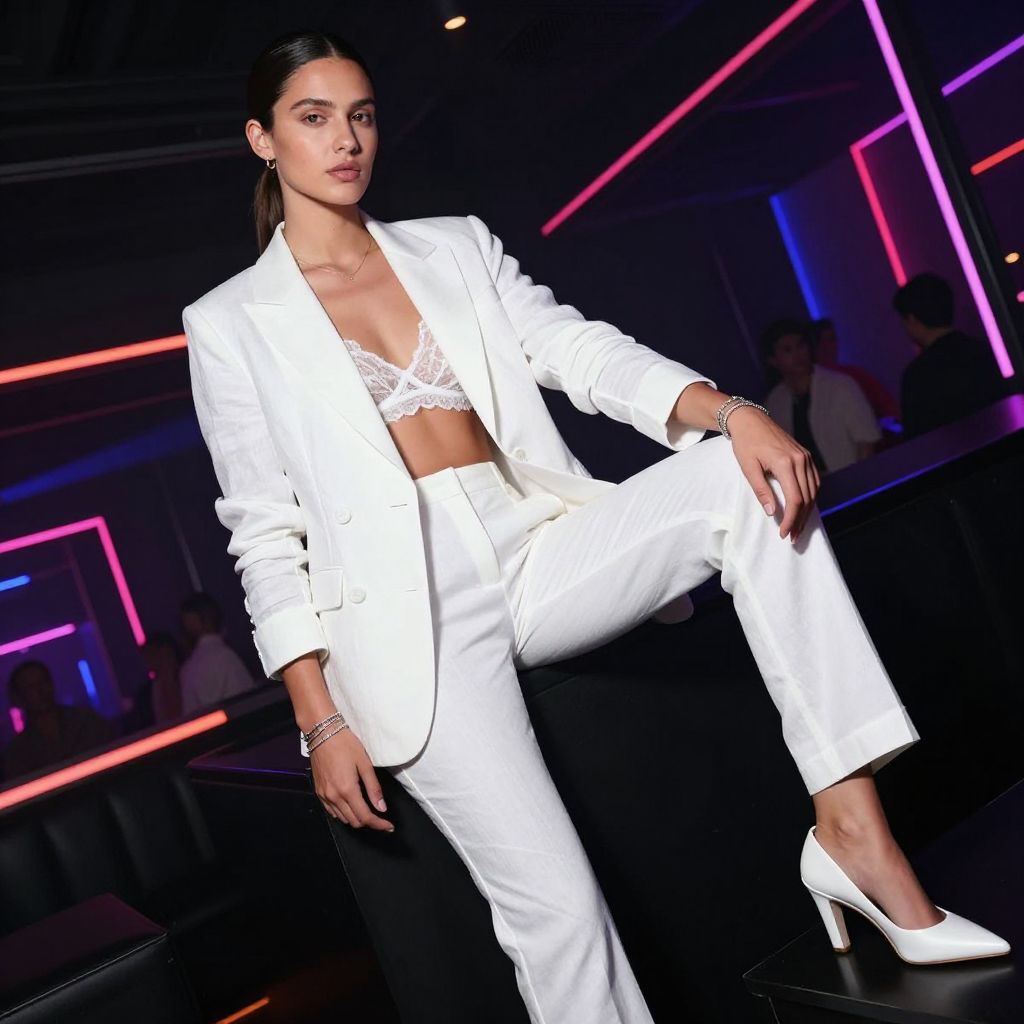A crisp white suit in the club whispers cool confidence and photographs like a dream under black light.