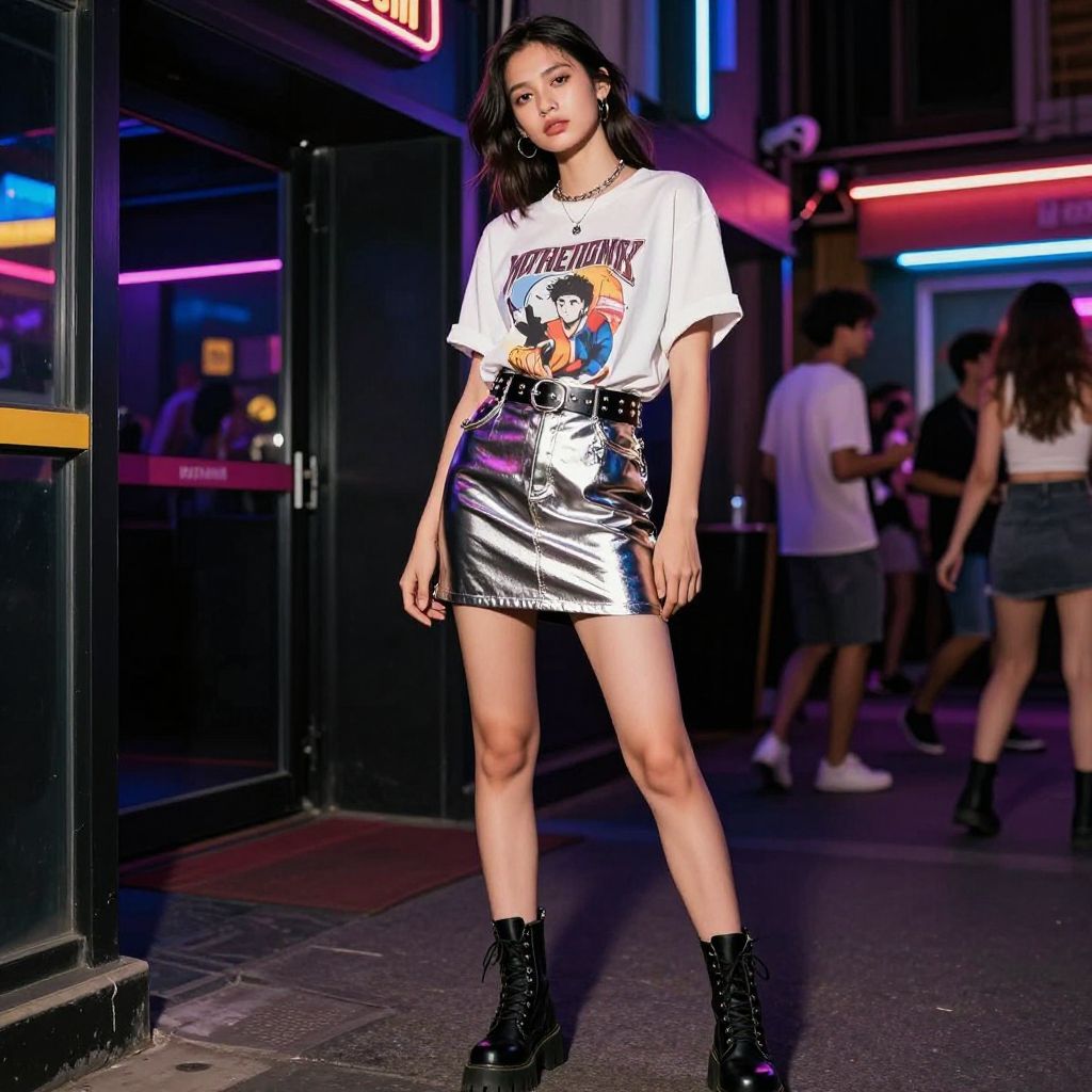 - Key pieces: Soft graphic tee, foil finish mini skirt, combat boots, studded belt