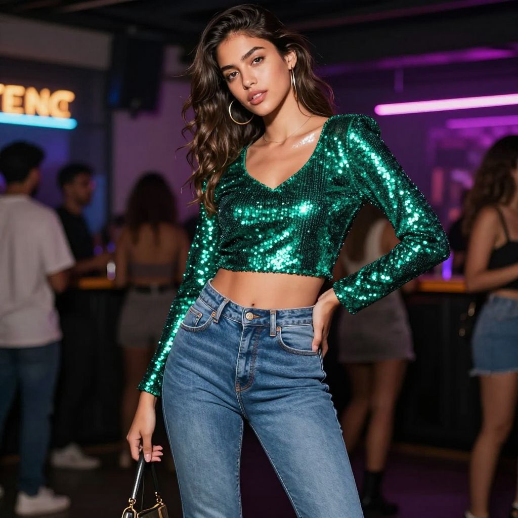 - Key pieces: Sequin crop, rigid denim jeans, hoop earrings, heeled sandals