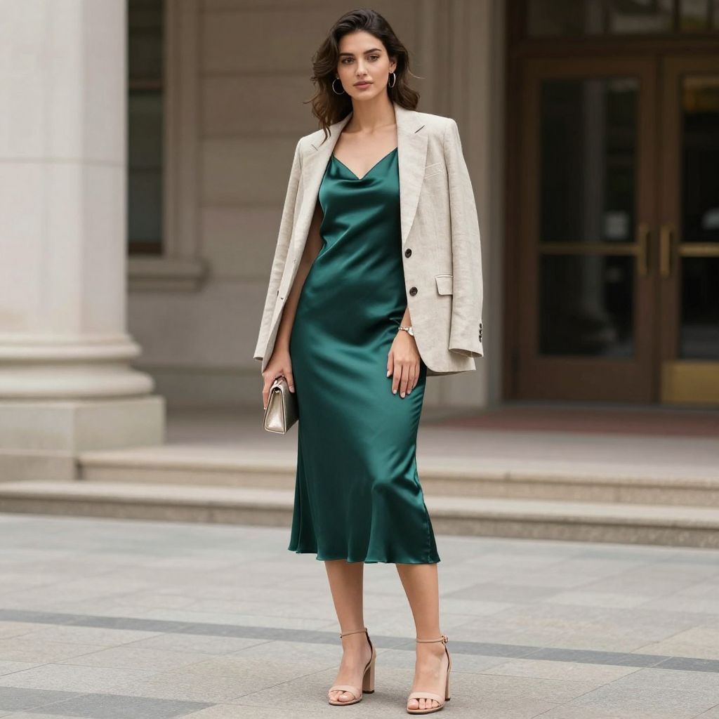 • Key pieces: satin midi slip, breathable linen blazer, strappy block heel, mini clutch