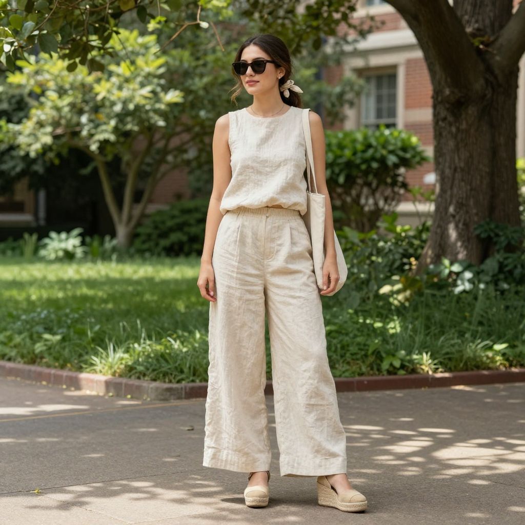 Linen works across seasons by changing your shoe style or layering a cropped knit later.