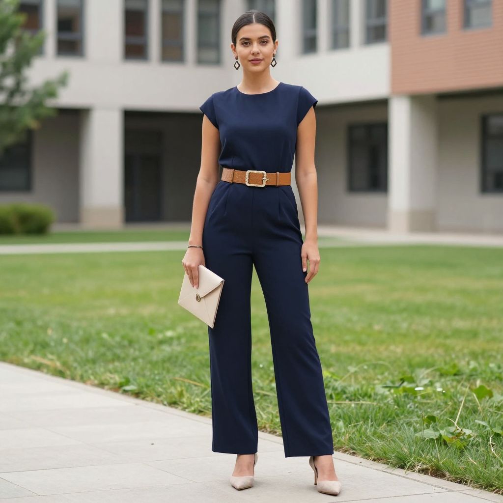 • Key pieces: structured jumpsuit, textured belt, pointed toe pump, envelope bag