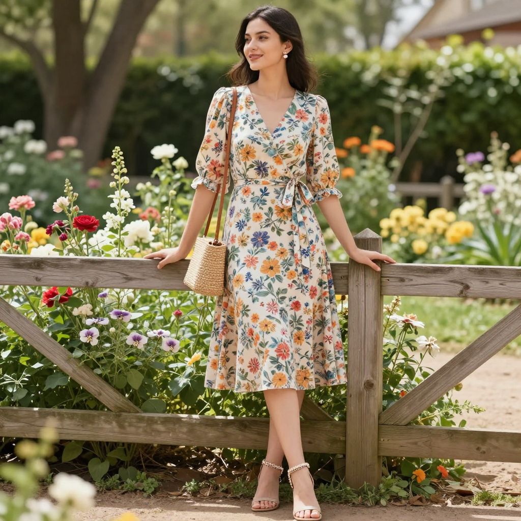 • Key pieces: printed wrap dress, raffia bag, ankle strap sandal