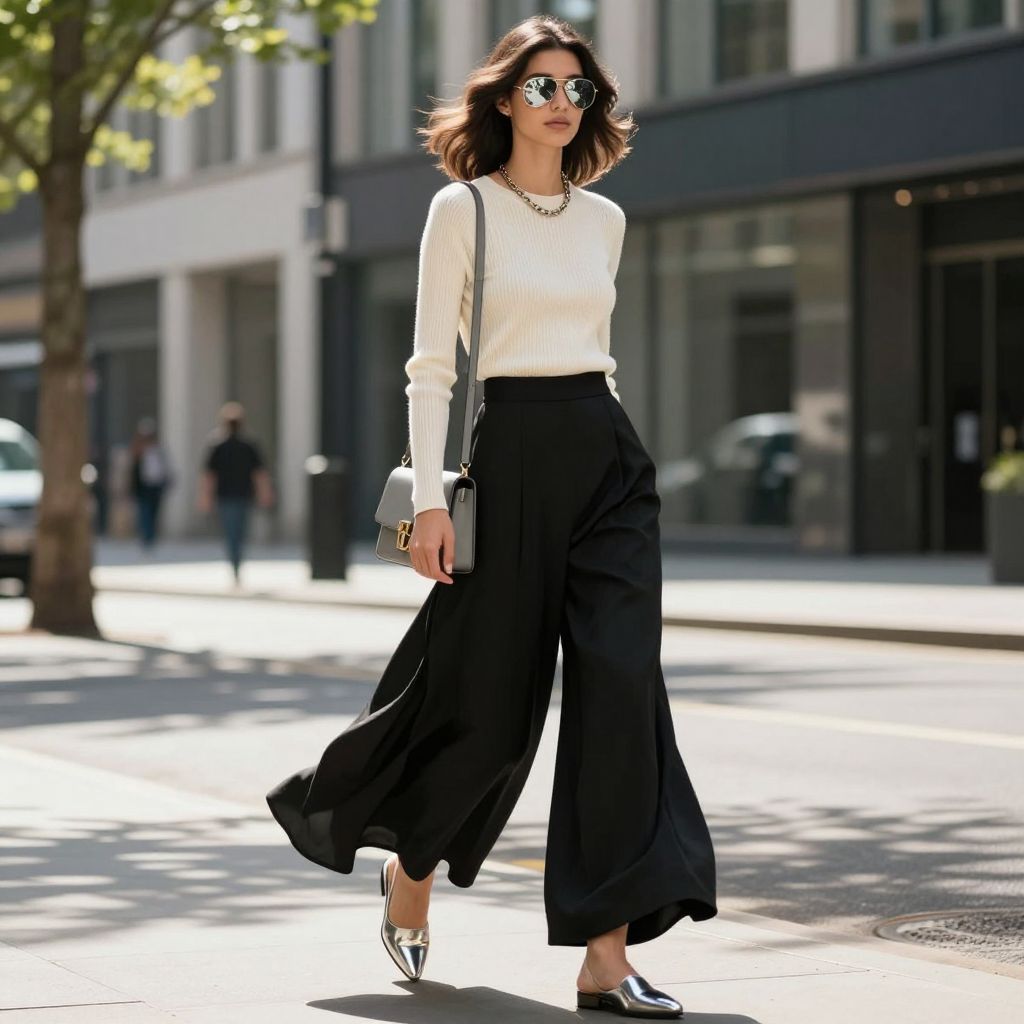 • Key pieces: palazzo pant, slim knit tee, metallic mule, crossbody bag