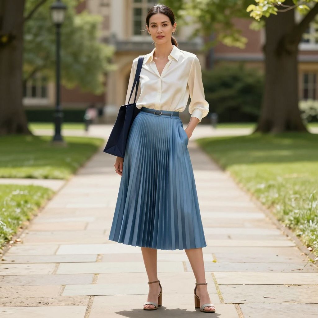 • Key pieces: pleated skirt, silk blouse, block heel, structured tote