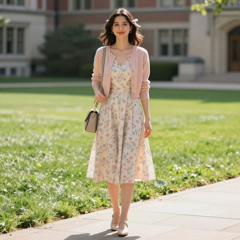 • Key pieces: tea dress, cropped cardi, T bar flat, small saddle bag
